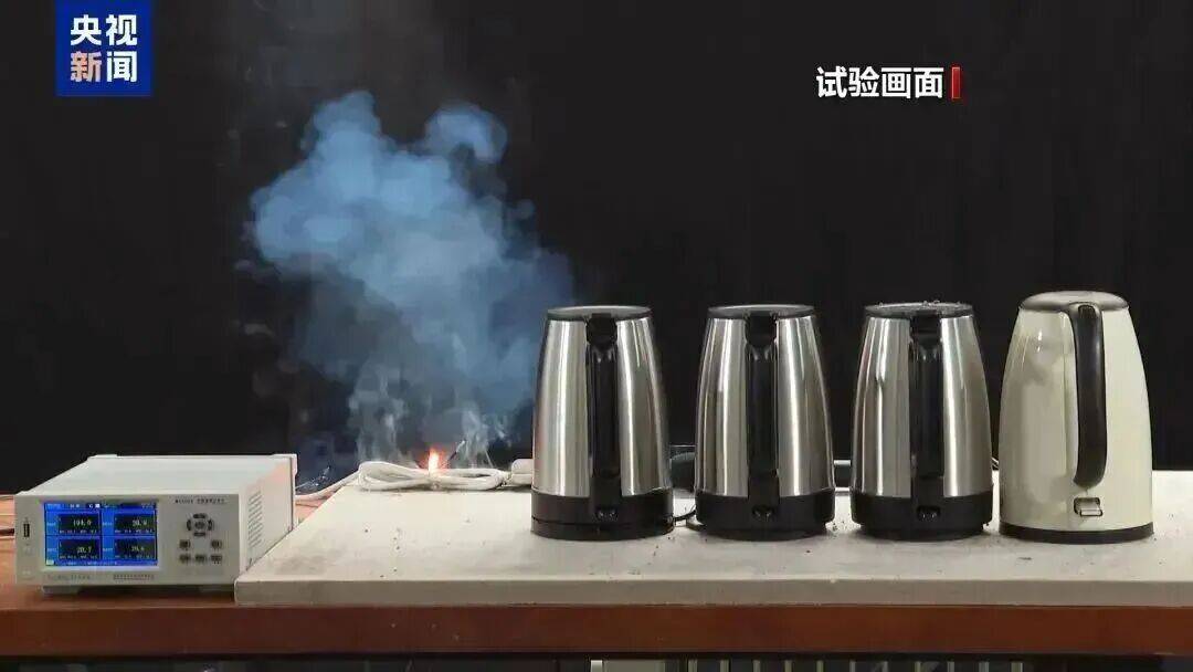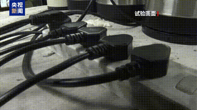 消防员将4个1800瓦的烧水壶插在2500瓦的插线板上,并把插线板电线捆扎在一起,四个水壶同时工作,用测温仪实时监测插线板电线的温度。