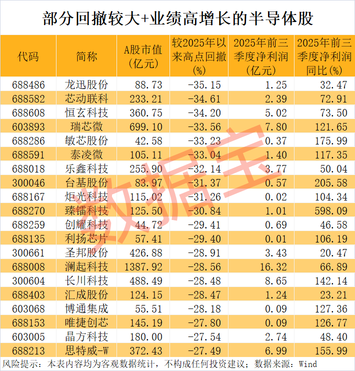 从当前的股价表现来看,不少业绩高增长的半导体股票已出现大幅回撤。据数据宝统计,今年前三季度净利润同比增长20%以上(含扭亏为盈)的股票中,截至11月17日收盘,最新收盘价与年内高点相比回撤幅度超20%的有50只。回撤幅度最大的前5只股票分别为龙迅股份、芯动联科、恒玄科技、瑞芯微、敏芯股份。
