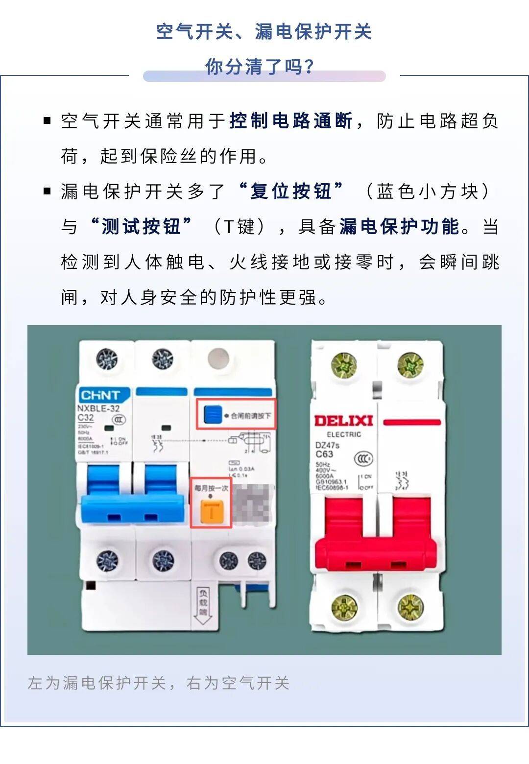 漏电跳闸:通常因线路或电器绝缘破损、环境潮湿引发漏电所致,此时漏电保护开关上的“复位按钮”(多为蓝色小方块)会自动弹出。