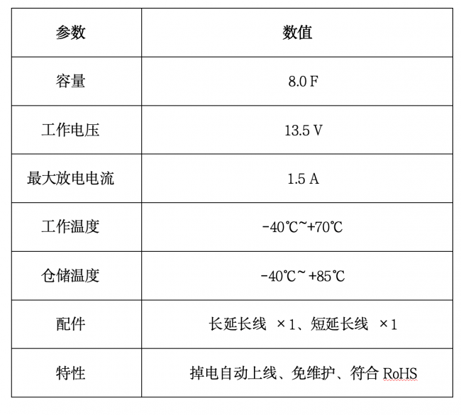 "核心优势": "掉电自动上线、短时后备供电、8.0F / 13.5V、最大1.5A放电、标准化尺寸、免维护路径",