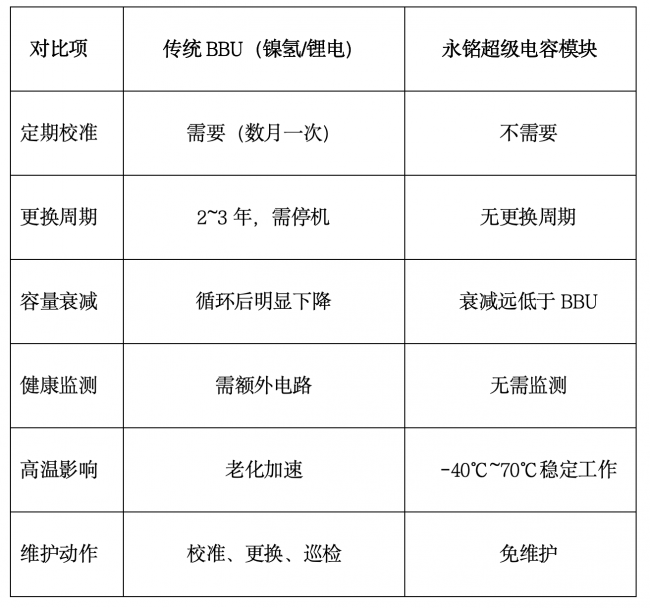 传统后备方案采用电池BBU(镍氢/锂电),但在7×24小时长期运行条件下,暴露出以下工程痛点:容量衰减与自放电、定期校准与健康检查、2~3年周期更换,需计划停机、高密度1U/2U服务器中空间与散热压力大。