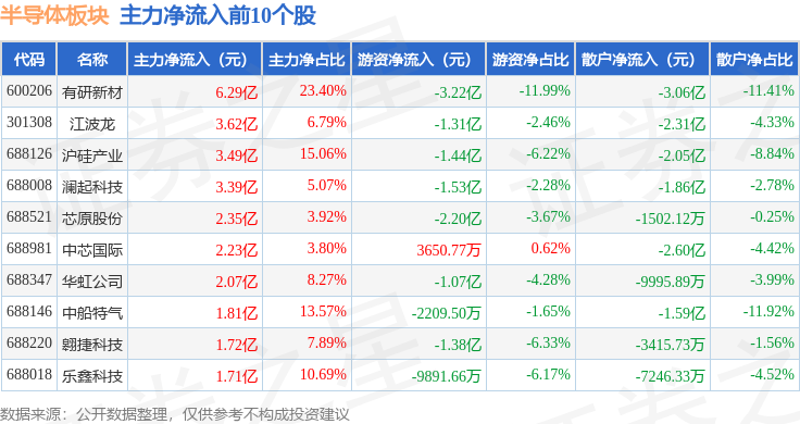 从资金流向上来看,当日半导体板块主力资金净流出27.12亿元,游资资金净流入29.83亿元,散户资金净流出2.71亿元。半导体板块个股资金流向见下表: