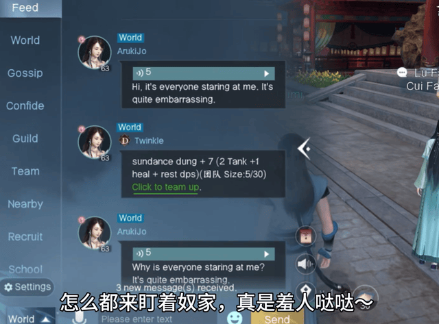 公屏上看到很多人在发:“Why is everyone staring at me?It's quit embarrassing!”(怎么都在盯着奴家看,真是羞人答答)。老外不断打着这样的虎狼之词,有人竖起了兰花指,有人撑起了油纸伞,画面十分劲爆。