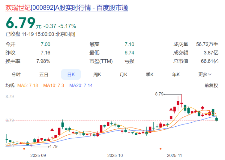 欢瑞世纪报收6.79元,日涨幅-5.17%,换手率7.98%,今年以来的涨幅为108.28%。