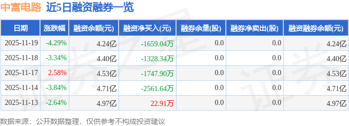中富电路融资融券信息显示,融资方面,当日融资买入3533.25万元,融资偿还5192.29万元,融资净偿还1659.04万元。融券方面,融券卖出0.0股,融券偿还0.0股,融券余量0.0股,融券余额0.0万元。融资融券余额4.24亿元。
