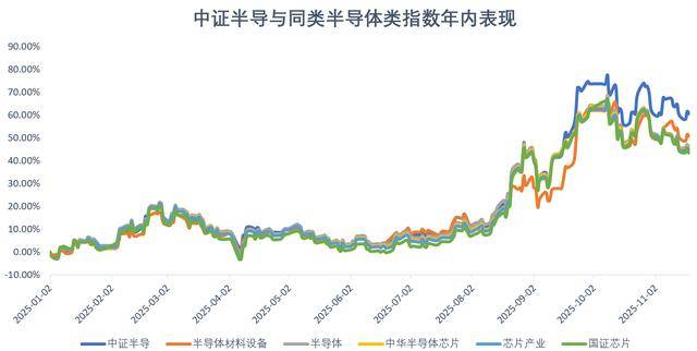 数据显示,截至11月19日,半导体设备ETF(561980)标的指数中证半导年内涨幅达54%、区间最大上涨超80%,在半导体材料设备、中华半导体芯片、芯片产业、国证芯片等主流半导体指数中位居第一,弹性表现突出。