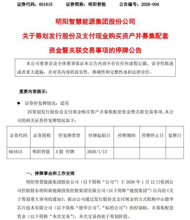 1月12日晚间,明阳智能(601615)公告称,公司于1月12日收到控股股东能投集团的通知,拟由公司通过发行股份及支付现金的方式收购中山德华芯片技术有限公司(以下简称“德华公司”)控制权,并募集配套资金。本次交易目前尚处于筹划阶段,预计不构成重大资产重组。为保证公平信息披露,维护投资者利益,公司股票自2026年1月13日起停牌,预计停牌时间不超过10个交易日。