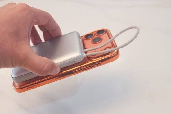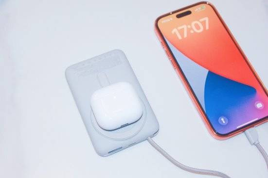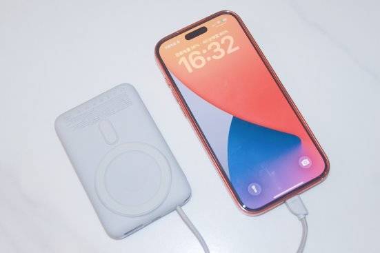 朗科移动电源内置16颗高性能钕铁硼磁体,形成直径60mm的磁吸区域,与iPhone12及以上机型实现"一贴即合"的吸附效果。吸附效果还是相当强的,几乎把手机平放过来也依旧能吸的稳稳的,手机也没有脱落下来。