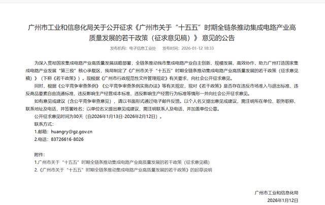 1月12日,广州市工业和信息化局发布征求《广州市关于“十五五”时期全链条推动集成电路产业高质量发展的若干政策(征求意见稿)》(下称《若干政策》)意见的公告。公开征求意见时间为30天(自2026年1月13日-2026年2月12日)。